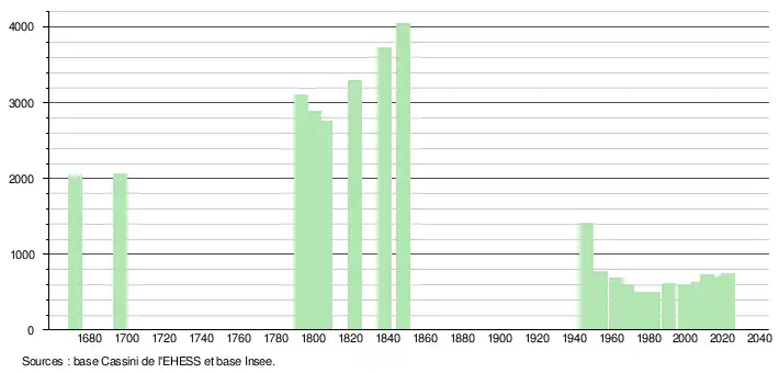 - ↑ Fiches Insee - Populations de référence de la commune pour les années 1672, 1696, 2006, 2007, 2008, 2009, 2010, 2011, 2012, 2013, 2014, 2015, 2016, 2017, 2018, 2019, 2020, 2021 et 2022.