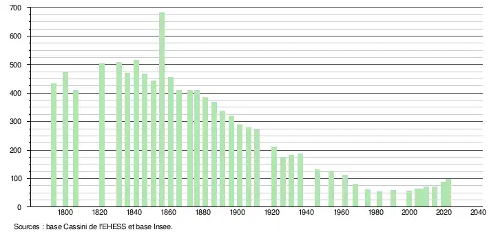 L'évolution du nombre d'habitants est connue à travers les recensements de la population effectués dans la commune depuis 1793. Pour les communes de moins de 10 000 habitants, une enquête de recensement portant sur toute la population est réalisée tous les cinq ans, les populations de référence des années intermédiaires étant quant à elles estimées par interpolation ou extrapolation[15]. Pour la commune, le premier recensement exhaustif entrant dans le cadre du nouveau dispositif a été réalisé en 2004[16].