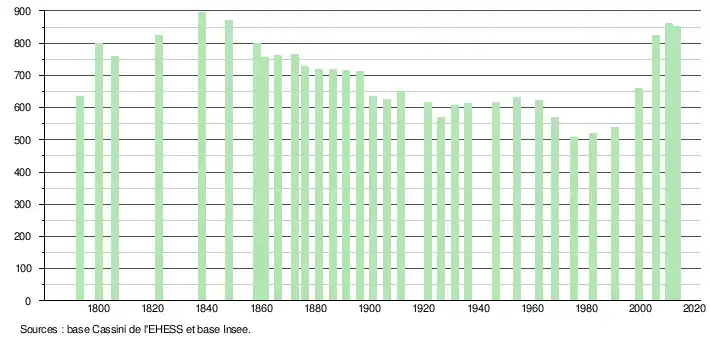L'évolution du nombre d'habitants est connue à travers les recensements de la population effectués dans la commune depuis 1793. À partir du , les populations légales des communes sont publiées annuellement dans le cadre d'un recensement qui repose désormais sur une collecte d'information annuelle, concernant successivement tous les territoires communaux au cours d'une période de cinq ans. Pour les communes de moins de 10 000 habitants, une enquête de recensement portant sur toute la population est réalisée tous les cinq ans, les populations légales des années intermédiaires étant quant à elles estimées par interpolation ou extrapolation[8]. Pour la commune, le premier recensement exhaustif entrant dans le cadre du nouveau dispositif a été réalisé en 2005[9],[Note 1].