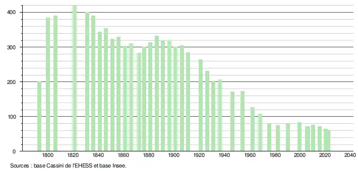 L'évolution du nombre d'habitants est connue à travers les recensements de la population effectués dans la commune depuis 1793. Pour les communes de moins de 10 000 habitants, une enquête de recensement portant sur toute la population est réalisée tous les cinq ans, les populations de référence des années intermédiaires étant quant à elles estimées par interpolation ou extrapolation[10]. Pour la commune, le premier recensement exhaustif entrant dans le cadre du nouveau dispositif a été réalisé en 2005[11].