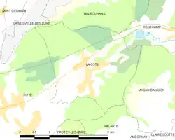 Au , La Côte est catégorisée commune rurale à habitat dispersé, selon la nouvelle grille communale de densité à sept niveaux définie par l'Insee en 2022[11]. Elle est située hors unité urbaine[12]. Par ailleurs la commune fait partie de l'aire d'attraction de Lure, dont elle est une commune de la couronne[Note 2],[12]. Cette aire, qui regroupe 33 communes, est catégorisée dans les aires de moins de 50 000 habitants[13],[14].