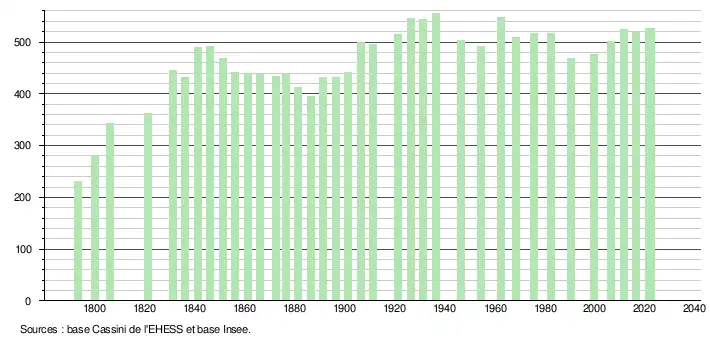 L'évolution du nombre d'habitants est connue à travers les recensements de la population effectués dans la commune depuis 1793. Pour les communes de moins de 10 000 habitants, une enquête de recensement portant sur toute la population est réalisée tous les cinq ans, les populations de référence des années intermédiaires étant quant à elles estimées par interpolation ou extrapolation[34]. Pour la commune, le premier recensement exhaustif entrant dans le cadre du nouveau dispositif a été réalisé en 2006[35].