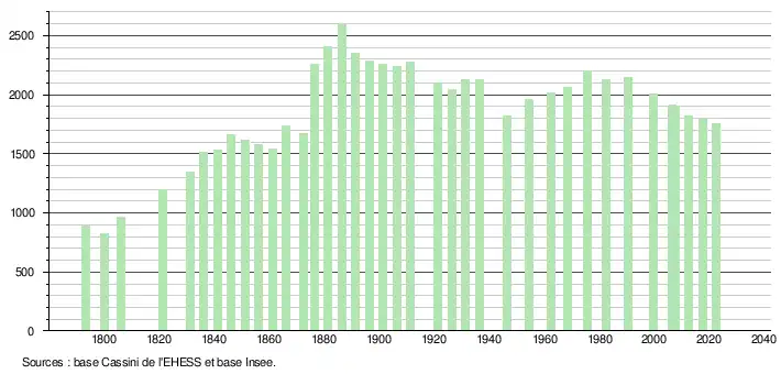 L'évolution du nombre d'habitants est connue à travers les recensements de la population effectués dans la commune depuis 1793. Pour les communes de moins de 10 000 habitants, une enquête de recensement portant sur toute la population est réalisée tous les cinq ans, les populations de référence des années intermédiaires étant quant à elles estimées par interpolation ou extrapolation[28]. Pour la commune, le premier recensement exhaustif entrant dans le cadre du nouveau dispositif a été réalisé en 2007[29].