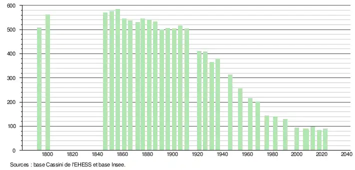 L'évolution du nombre d'habitants est connue à travers les recensements de la population effectués dans la commune depuis 1793. Pour les communes de moins de 10 000 habitants, une enquête de recensement portant sur toute la population est réalisée tous les cinq ans, les populations de référence des années intermédiaires étant quant à elles estimées par interpolation ou extrapolation[50]. Pour la commune, le premier recensement exhaustif entrant dans le cadre du nouveau dispositif a été réalisé en 2007[51].