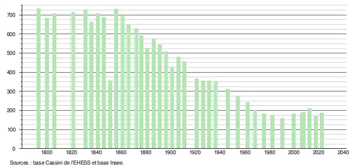 L'évolution du nombre d'habitants est connue à travers les recensements de la population effectués dans la commune depuis 1793. Pour les communes de moins de 10 000 habitants, une enquête de recensement portant sur toute la population est réalisée tous les cinq ans, les populations de référence des années intermédiaires étant quant à elles estimées par interpolation ou extrapolation[29]. Pour la commune, le premier recensement exhaustif entrant dans le cadre du nouveau dispositif a été réalisé en 2007[30].