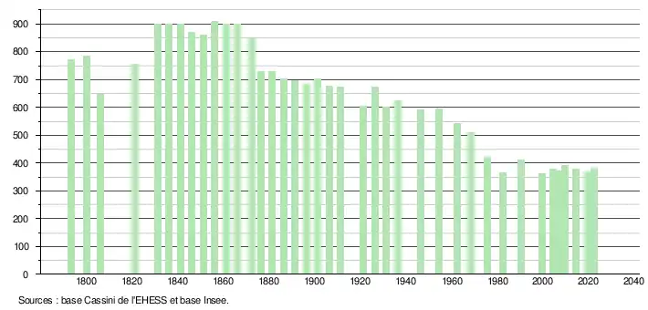 L'évolution du nombre d'habitants est connue à travers les recensements de la population effectués dans la commune depuis 1793. Pour les communes de moins de 10 000 habitants, une enquête de recensement portant sur toute la population est réalisée tous les cinq ans, les populations de référence des années intermédiaires étant quant à elles estimées par interpolation ou extrapolation[23]. Pour la commune, le premier recensement exhaustif entrant dans le cadre du nouveau dispositif a été réalisé en 2004[24].