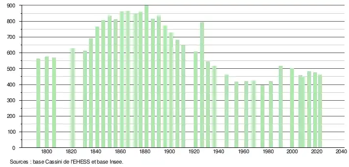 L'évolution du nombre d'habitants est connue à travers les recensements de la population effectués dans la commune depuis 1793. Pour les communes de moins de 10 000 habitants, une enquête de recensement portant sur toute la population est réalisée tous les cinq ans, les populations de référence des années intermédiaires étant quant à elles estimées par interpolation ou extrapolation[23]. Pour la commune, le premier recensement exhaustif entrant dans le cadre du nouveau dispositif a été réalisé en 2008[24].