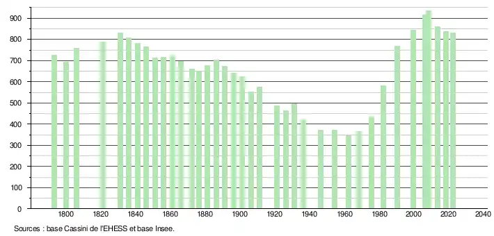 L'évolution du nombre d'habitants est connue à travers les recensements de la population effectués dans la commune depuis 1793. Pour les communes de moins de 10 000 habitants, une enquête de recensement portant sur toute la population est réalisée tous les cinq ans, les populations de référence des années intermédiaires étant quant à elles estimées par interpolation ou extrapolation[16]. Pour la commune, le premier recensement exhaustif entrant dans le cadre du nouveau dispositif a été réalisé en 2008[17].
