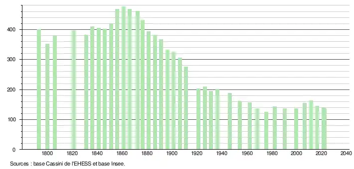 L'évolution du nombre d'habitants est connue à travers les recensements de la population effectués dans la commune depuis 1793. Pour les communes de moins de 10 000 habitants, une enquête de recensement portant sur toute la population est réalisée tous les cinq ans, les populations de référence des années intermédiaires étant quant à elles estimées par interpolation ou extrapolation[20]. Pour la commune, le premier recensement exhaustif entrant dans le cadre du nouveau dispositif a été réalisé en 2006[21].