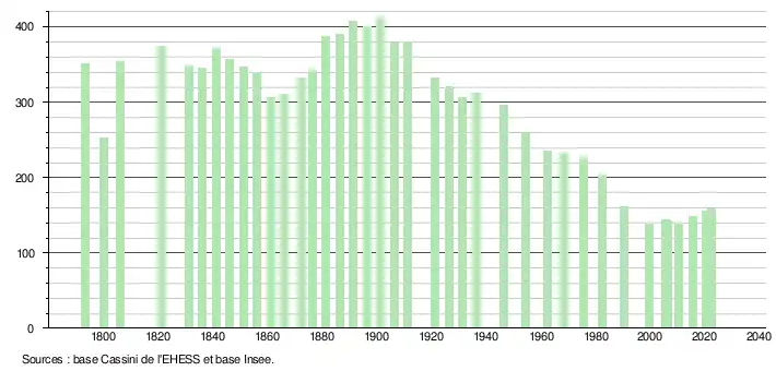 L'évolution du nombre d'habitants est connue à travers les recensements de la population effectués dans la commune depuis 1793. Pour les communes de moins de 10 000 habitants, une enquête de recensement portant sur toute la population est réalisée tous les cinq ans, les populations de référence des années intermédiaires étant quant à elles estimées par interpolation ou extrapolation[30]. Pour la commune, le premier recensement exhaustif entrant dans le cadre du nouveau dispositif a été réalisé en 2005[31].