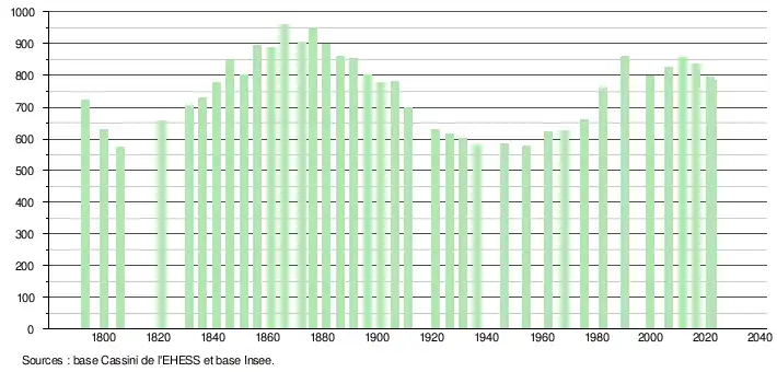 L'évolution du nombre d'habitants est connue à travers les recensements de la population effectués dans la commune depuis 1793. Pour les communes de moins de 10 000 habitants, une enquête de recensement portant sur toute la population est réalisée tous les cinq ans, les populations de référence des années intermédiaires étant quant à elles estimées par interpolation ou extrapolation[14]. Pour la commune, le premier recensement exhaustif entrant dans le cadre du nouveau dispositif a été réalisé en 2006[15].