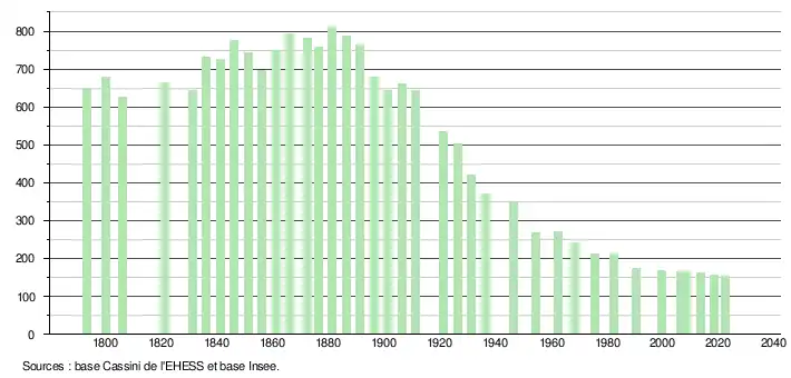 L'évolution du nombre d'habitants est connue à travers les recensements de la population effectués dans la commune depuis 1793. Pour les communes de moins de 10 000 habitants, une enquête de recensement portant sur toute la population est réalisée tous les cinq ans, les populations de référence des années intermédiaires étant quant à elles estimées par interpolation ou extrapolation[28]. Pour la commune, le premier recensement exhaustif entrant dans le cadre du nouveau dispositif a été réalisé en 2008[29].