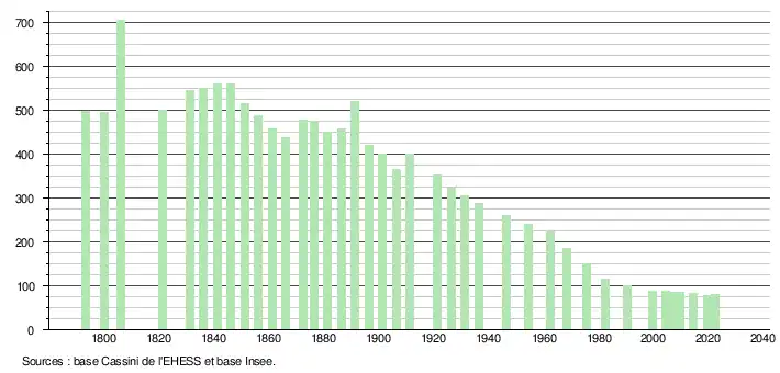 L'évolution du nombre d'habitants est connue à travers les recensements de la population effectués dans la commune depuis 1793. Pour les communes de moins de 10 000 habitants, une enquête de recensement portant sur toute la population est réalisée tous les cinq ans, les populations de référence des années intermédiaires étant quant à elles estimées par interpolation ou extrapolation[21]. Pour la commune, le premier recensement exhaustif entrant dans le cadre du nouveau dispositif a été réalisé en 2004[22].