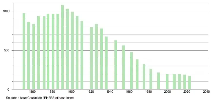 L'évolution du nombre d'habitants est connue à travers les recensements de la population effectués dans la commune depuis 1851. Pour les communes de moins de 10 000 habitants, une enquête de recensement portant sur toute la population est réalisée tous les cinq ans, les populations de référence des années intermédiaires étant quant à elles estimées par interpolation ou extrapolation[15]. Pour la commune, le premier recensement exhaustif entrant dans le cadre du nouveau dispositif a été réalisé en 2007[16].