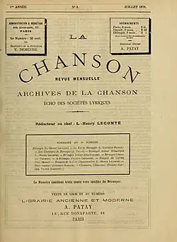 Le 1er mai 1878 parait le premier numéro de La Chanson, Revue mensuelle, Archives de la chanson, Écho des sociétés lyriques[1].