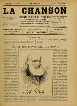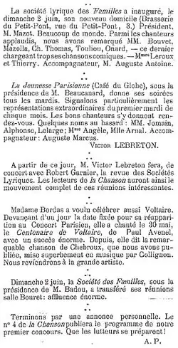 La Chanson mensuel de juillet à , puis bimensuel de à et enfin hebdomadaire de à , donne une foule d'informations sur les sociétés chantantes, la chanson et les chansonniers et publie de nombreuses chansons.