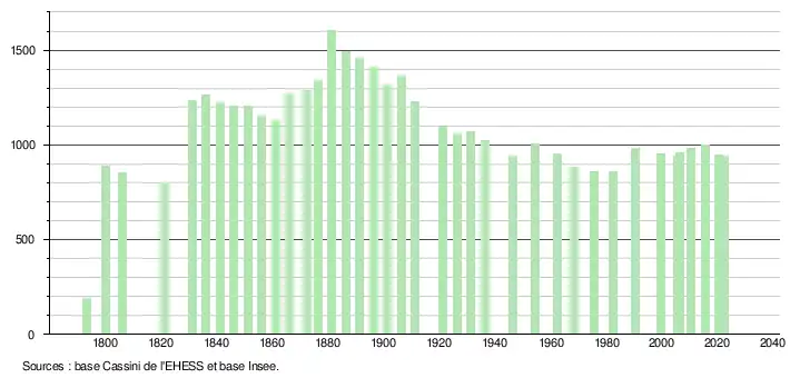 L'évolution du nombre d'habitants est connue à travers les recensements de la population effectués dans la commune depuis 1793. Pour les communes de moins de 10 000 habitants, une enquête de recensement portant sur toute la population est réalisée tous les cinq ans, les populations de référence des années intermédiaires étant quant à elles estimées par interpolation ou extrapolation[16]. Pour la commune, le premier recensement exhaustif entrant dans le cadre du nouveau dispositif a été réalisé en 2005[17].