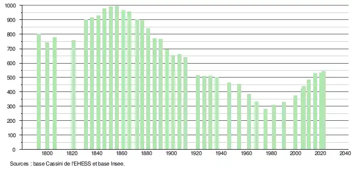 L'évolution du nombre d'habitants est connue à travers les recensements de la population effectués dans la commune depuis 1793. Pour les communes de moins de 10 000 habitants, une enquête de recensement portant sur toute la population est réalisée tous les cinq ans, les populations de référence des années intermédiaires étant quant à elles estimées par interpolation ou extrapolation[44]. Pour la commune, le premier recensement exhaustif entrant dans le cadre du nouveau dispositif a été réalisé en 2005[45].