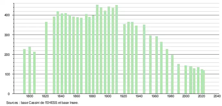 L'évolution du nombre d'habitants est connue à travers les recensements de la population effectués dans la commune depuis 1793. Pour les communes de moins de 10 000 habitants, une enquête de recensement portant sur toute la population est réalisée tous les cinq ans, les populations de référence des années intermédiaires étant quant à elles estimées par interpolation ou extrapolation[19]. Pour la commune, le premier recensement exhaustif entrant dans le cadre du nouveau dispositif a été réalisé en 2005[20].