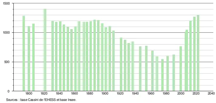 L'évolution du nombre d'habitants est connue à travers les recensements de la population effectués dans la commune depuis 1793. Pour les communes de moins de 10 000 habitants, une enquête de recensement portant sur toute la population est réalisée tous les cinq ans, les populations de référence des années intermédiaires étant quant à elles estimées par interpolation ou extrapolation[32]. Pour la commune, le premier recensement exhaustif entrant dans le cadre du nouveau dispositif a été réalisé en 2007[33].