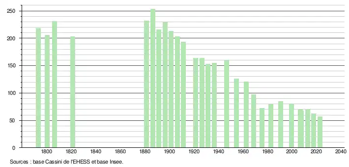 L'évolution du nombre d'habitants est connue à travers les recensements de la population effectués dans la commune depuis 1793. Pour les communes de moins de 10 000 habitants, une enquête de recensement portant sur toute la population est réalisée tous les cinq ans, les populations de référence des années intermédiaires étant quant à elles estimées par interpolation ou extrapolation[46]. Pour la commune, le premier recensement exhaustif entrant dans le cadre du nouveau dispositif a été réalisé en 2007[47].