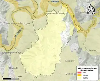Le retrait-gonflement des sols argileux est susceptible d'engendrer des dommages importants aux bâtiments en cas d’alternance de périodes de sécheresse et de pluie. 3,4 % de la superficie communale est en aléa moyen ou fort (26,8 % au niveau départemental et 48,5 % au niveau national). Sur les 147 bâtiments dénombrés sur la commune en 2019, aucun n'est en aléa moyen ou fort, à comparer aux 36 % au niveau départemental et 54 % au niveau national. Une cartographie de l'exposition du territoire national au retrait gonflement des sols argileux est disponible sur le site du BRGM[17],[Carte 2].
