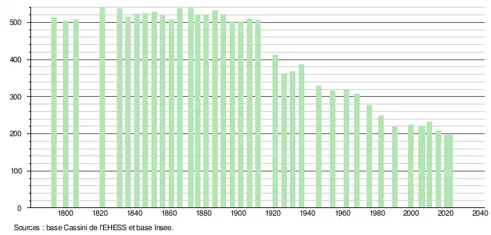 L'évolution du nombre d'habitants est connue à travers les recensements de la population effectués dans la commune depuis 1793. Pour les communes de moins de 10 000 habitants, une enquête de recensement portant sur toute la population est réalisée tous les cinq ans, les populations de référence des années intermédiaires étant quant à elles estimées par interpolation ou extrapolation[23]. Pour la commune, le premier recensement exhaustif entrant dans le cadre du nouveau dispositif a été réalisé en 2005[24].