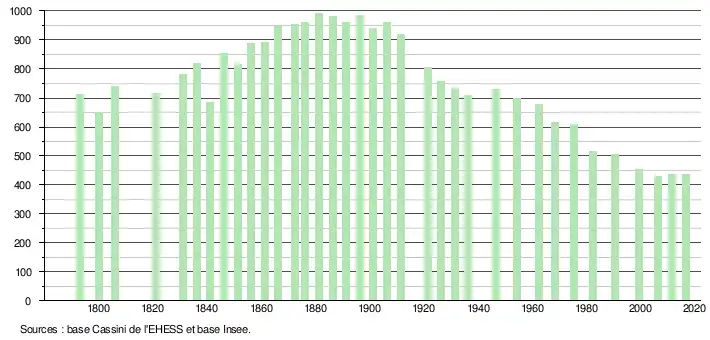 L'évolution du nombre d'habitants est connue à travers les recensements de la population effectués dans la commune depuis 1793. Pour les communes de moins de 10 000 habitants, une enquête de recensement portant sur toute la population est réalisée tous les cinq ans, les populations de référence des années intermédiaires étant quant à elles estimées par interpolation ou extrapolation[14]. Pour la commune, le premier recensement exhaustif entrant dans le cadre du nouveau dispositif a été réalisé en 2006[15].