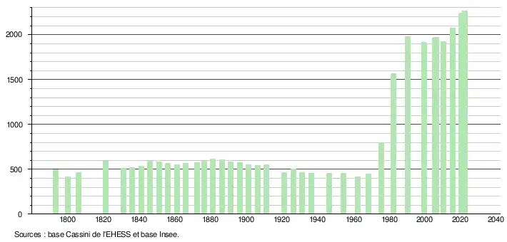 L'évolution du nombre d'habitants est connue à travers les recensements de la population effectués dans la commune depuis 1793. Pour les communes de moins de 10 000 habitants, une enquête de recensement portant sur toute la population est réalisée tous les cinq ans, les populations de référence des années intermédiaires étant quant à elles estimées par interpolation ou extrapolation[27]. Pour la commune, le premier recensement exhaustif entrant dans le cadre du nouveau dispositif a été réalisé en 2005[28].