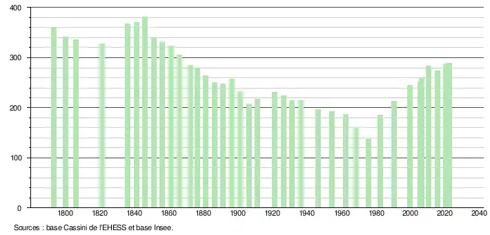 L'évolution du nombre d'habitants est connue à travers les recensements de la population effectués dans la commune depuis 1793. Pour les communes de moins de 10 000 habitants, une enquête de recensement portant sur toute la population est réalisée tous les cinq ans, les populations de référence des années intermédiaires étant quant à elles estimées par interpolation ou extrapolation[24]. Pour la commune, le premier recensement exhaustif entrant dans le cadre du nouveau dispositif a été réalisé en 2005[25].