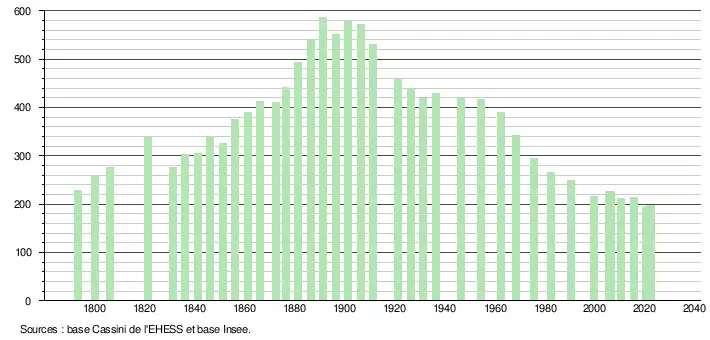 L'évolution du nombre d'habitants est connue à travers les recensements de la population effectués dans la commune depuis 1793. Pour les communes de moins de 10 000 habitants, une enquête de recensement portant sur toute la population est réalisée tous les cinq ans, les populations de référence des années intermédiaires étant quant à elles estimées par interpolation ou extrapolation[17]. Pour la commune, le premier recensement exhaustif entrant dans le cadre du nouveau dispositif a été réalisé en 2005[18].