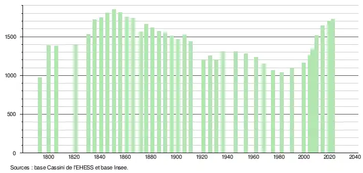 L'évolution du nombre d'habitants est connue à travers les recensements de la population effectués dans la commune depuis 1793. Pour les communes de moins de 10 000 habitants, une enquête de recensement portant sur toute la population est réalisée tous les cinq ans, les populations de référence des années intermédiaires étant quant à elles estimées par interpolation ou extrapolation[24]. Pour la commune, le premier recensement exhaustif entrant dans le cadre du nouveau dispositif a été réalisé en 2004[25].
