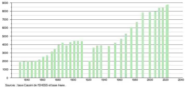 L'évolution du nombre d'habitants est connue à travers les recensements de la population effectués dans la commune depuis 1831. Pour les communes de moins de 10 000 habitants, une enquête de recensement portant sur toute la population est réalisée tous les cinq ans, les populations de référence des années intermédiaires étant quant à elles estimées par interpolation ou extrapolation[28]. Pour la commune, le premier recensement exhaustif entrant dans le cadre du nouveau dispositif a été réalisé en 2006[29].