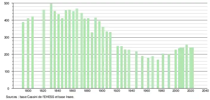 L'évolution du nombre d'habitants est connue à travers les recensements de la population effectués dans la commune depuis 1793. Pour les communes de moins de 10 000 habitants, une enquête de recensement portant sur toute la population est réalisée tous les cinq ans, les populations de référence des années intermédiaires étant quant à elles estimées par interpolation ou extrapolation[22]. Pour la commune, le premier recensement exhaustif entrant dans le cadre du nouveau dispositif a été réalisé en 2004[23].