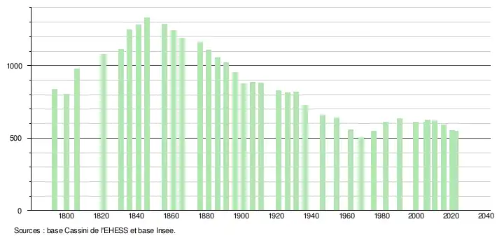 L'évolution du nombre d'habitants est connue à travers les recensements de la population effectués dans la commune depuis 1793. Pour les communes de moins de 10 000 habitants, une enquête de recensement portant sur toute la population est réalisée tous les cinq ans, les populations de référence des années intermédiaires étant quant à elles estimées par interpolation ou extrapolation[21]. Pour la commune, le premier recensement exhaustif entrant dans le cadre du nouveau dispositif a été réalisé en 2005[22].