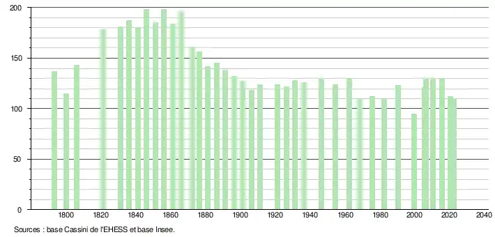L'évolution du nombre d'habitants est connue à travers les recensements de la population effectués dans la commune depuis 1793. Pour les communes de moins de 10 000 habitants, une enquête de recensement portant sur toute la population est réalisée tous les cinq ans, les populations de référence des années intermédiaires étant quant à elles estimées par interpolation ou extrapolation[24]. Pour la commune, le premier recensement exhaustif entrant dans le cadre du nouveau dispositif a été réalisé en 2005[25].