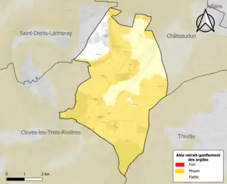 Le retrait-gonflement des sols argileux est susceptible d'engendrer des dommages importants aux bâtiments en cas d’alternance de périodes de sécheresse et de pluie. 71,9 % de la superficie communale est en aléa moyen ou fort (52,8 % au niveau départemental et 48,5 % au niveau national). Sur les 505 bâtiments dénombrés sur la commune en 2019, 309 sont en aléa moyen ou fort, soit 61 %, à comparer aux 70 % au niveau départemental et 54 % au niveau national. Une cartographie de l'exposition du territoire national au retrait gonflement des sols argileux est disponible sur le site du BRGM[18],[Carte 2].