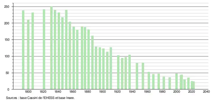 L'évolution du nombre d'habitants est connue à travers les recensements de la population effectués dans la commune depuis 1793. Pour les communes de moins de 10 000 habitants, une enquête de recensement portant sur toute la population est réalisée tous les cinq ans, les populations de référence des années intermédiaires étant quant à elles estimées par interpolation ou extrapolation[15]. Pour la commune, le premier recensement exhaustif entrant dans le cadre du nouveau dispositif a été réalisé en 2005[16].