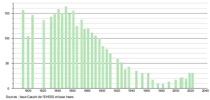 L'évolution du nombre d'habitants est connue à travers les recensements de la population effectués dans la commune depuis 1793. Pour les communes de moins de 10 000 habitants, une enquête de recensement portant sur toute la population est réalisée tous les cinq ans, les populations de référence des années intermédiaires étant quant à elles estimées par interpolation ou extrapolation[17]. Pour la commune, le premier recensement exhaustif entrant dans le cadre du nouveau dispositif a été réalisé en 2008[18].