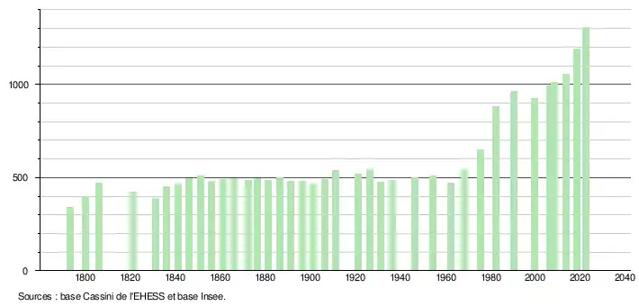 L'évolution du nombre d'habitants est connue à travers les recensements de la population effectués dans la commune depuis 1793. Pour les communes de moins de 10 000 habitants, une enquête de recensement portant sur toute la population est réalisée tous les cinq ans, les populations de référence des années intermédiaires étant quant à elles estimées par interpolation ou extrapolation[24]. Pour la commune, le premier recensement exhaustif entrant dans le cadre du nouveau dispositif a été réalisé en 2008[25].