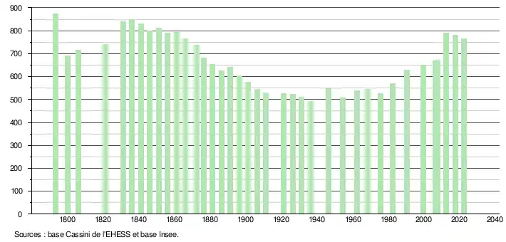 L'évolution du nombre d'habitants est connue à travers les recensements de la population effectués dans la commune depuis 1793. Pour les communes de moins de 10 000 habitants, une enquête de recensement portant sur toute la population est réalisée tous les cinq ans, les populations de référence des années intermédiaires étant quant à elles estimées par interpolation ou extrapolation[26]. Pour la commune, le premier recensement exhaustif entrant dans le cadre du nouveau dispositif a été réalisé en 2007[27].