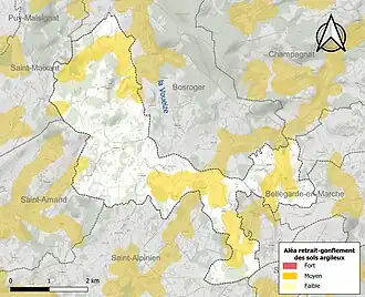 Le retrait-gonflement des sols argileux est susceptible d'engendrer des dommages importants aux bâtiments en cas d’alternance de périodes de sécheresse et de pluie. 31,2 % de la superficie communale est en aléa moyen ou fort (33,6 % au niveau départemental et 48,5 % au niveau national). Sur les 71 bâtiments dénombrés sur la commune en 2019, 7 sont en aléa moyen ou fort, soit 10 %, à comparer aux 25 % au niveau départemental et 54 % au niveau national. Une cartographie de l'exposition du territoire national au retrait gonflement des sols argileux est disponible sur le site du BRGM[17],[Carte 2].
