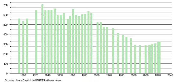 L'évolution du nombre d'habitants est connue à travers les recensements de la population effectués dans la commune depuis 1793. Pour les communes de moins de 10 000 habitants, une enquête de recensement portant sur toute la population est réalisée tous les cinq ans, les populations de référence des années intermédiaires étant quant à elles estimées par interpolation ou extrapolation[16]. Pour la commune, le premier recensement exhaustif entrant dans le cadre du nouveau dispositif a été réalisé en 2005[17].