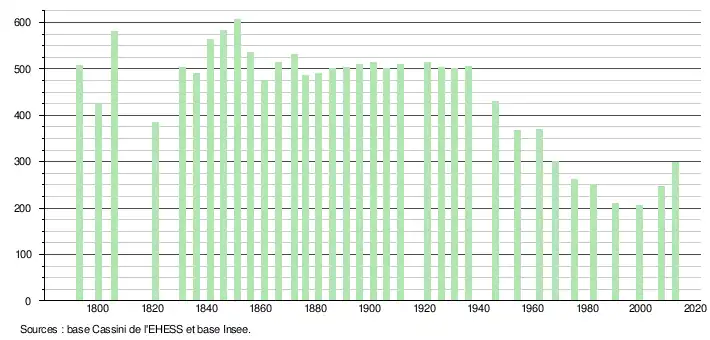 - ↑ Par convention dans Wikipédia, le principe a été retenu de n’afficher dans le tableau des recensements et le graphique, pour les populations légales postérieures à 1999, que les populations correspondant à une enquête exhaustive de recensement pour les communes de moins de 10 000 habitants, et que les populations des années 2006, 2011, 2016, etc. pour les communes de plus de 10 000 habitants, ainsi que la dernière population légale publiée par l’Insee pour l'ensemble des communes.