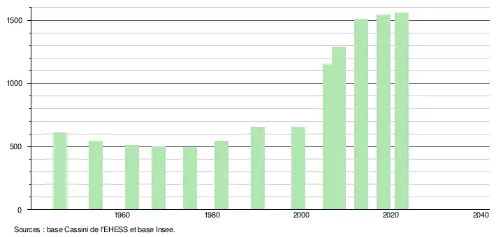L'évolution du nombre d'habitants est connue à travers les recensements de la population effectués dans la commune depuis 1946. Pour les communes de moins de 10000habitants, une enquête de recensement portant sur toute la population est réalisée tous les cinqans, les populations de référence des années intermédiaires étant quant à elles estimées par interpolation ou extrapolation[21]. Pour la commune, le premier recensement exhaustif entrant dans le cadre du nouveau dispositif a été réalisé en 2008[22].