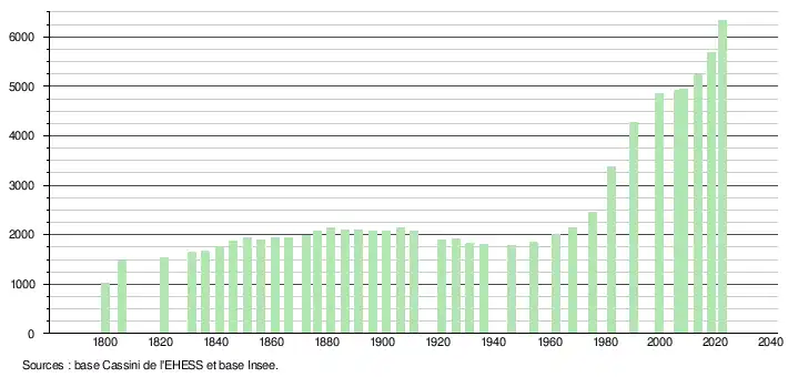 L'évolution du nombre d'habitants est connue à travers les recensements de la population effectués dans la commune depuis 1800. Pour les communes de moins de 10 000 habitants, une enquête de recensement portant sur toute la population est réalisée tous les cinq ans, les populations de référence des années intermédiaires étant quant à elles estimées par interpolation ou extrapolation[34]. Pour la commune, le premier recensement exhaustif entrant dans le cadre du nouveau dispositif a été réalisé en 2008[35].