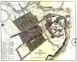 Un premier faubourg, nommé Hiché et qui deviendra Saint-Roch, voit le jour au milieu du 18e siècle. Sa création permet de reloger les artisans et les ouvriers en dehors des murs. Le faubourg Saint-Jean s'urbanise à son tour à partir des années 1780. En 1789, un premier pont enjambant la Saint-Charles est construit à l'emplacement actuel du pont Drouin[12]. En 1792, les deux faubourgs sont intégrés à la ville de Québec lorsque ses limites sont repoussées jusqu'à une ligne plus à l'ouest correspondant approximativement à l'actuel boulevard Langelier. Un troisième faubourg, Saint-Louis, s'ajoutera aux deux précédents et à la cité fortifiée. Ces faubourgs seront rasés et reconstruits à la suite d'incendies durant le 19e siècle (1845, 1866, 1881).