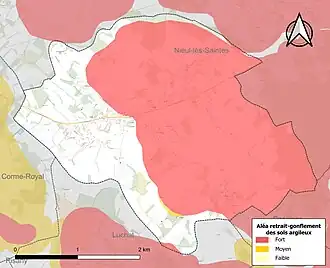 Le retrait-gonflement des sols argileux est susceptible d'engendrer des dommages importants aux bâtiments en cas d’alternance de périodes de sécheresse et de pluie. 66,3 % de la superficie communale est en aléa moyen ou fort (54,2 % au niveau départemental et 48,5 % au niveau national). Sur les 317 bâtiments dénombrés sur la commune en 2019, 213 sont en aléa moyen ou fort, soit 67 %, à comparer aux 57 % au niveau départemental et 54 % au niveau national. Une cartographie de l'exposition du territoire national au retrait gonflement des sols argileux est disponible sur le site du BRGM[13],[Carte 2].