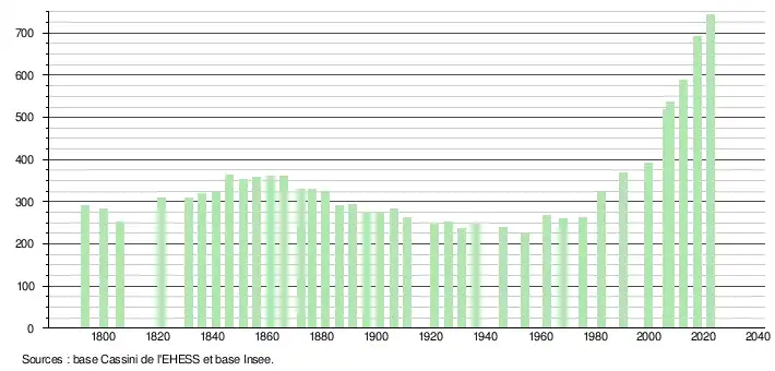 L'évolution du nombre d'habitants est connue à travers les recensements de la population effectués dans la commune depuis 1793. Pour les communes de moins de 10 000 habitants, une enquête de recensement portant sur toute la population est réalisée tous les cinq ans, les populations de référence des années intermédiaires étant quant à elles estimées par interpolation ou extrapolation[17]. Pour la commune, le premier recensement exhaustif entrant dans le cadre du nouveau dispositif a été réalisé en 2007[18].