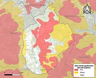 Le retrait-gonflement des sols argileux est susceptible d'engendrer des dommages importants aux bâtiments en cas d’alternance de périodes de sécheresse et de pluie. 60,3 % de la superficie communale est en aléa moyen ou fort (54,2 % au niveau départemental et 48,5 % au niveau national). Sur les 383 bâtiments dénombrés sur la commune en 2019, 233 sont en aléa moyen ou fort, soit 61 %, à comparer aux 57 % au niveau départemental et 54 % au niveau national. Une cartographie de l'exposition du territoire national au retrait gonflement des sols argileux est disponible sur le site du BRGM[15],[Carte 2].